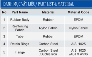 Khớp nối mềm cao su được chế tạo từ 3 lớp: Lớp giữa bằng Nylon, lớp trong, lớp ngoài đều bằng cao su EPDM nên tạo độ dẻo dai, độ đàn hồi và độ bền sử dụng cao. Mặt bích được chế tạo từ gang cầu hoặc thép.