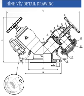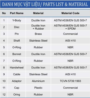 Thiết kế hình dạng chữ Y, cho dòng chảy hiệu quả. Đĩa van làm từ gang cầu bọc cao su, trục van làm từ thép không gỉ cho độ bền cao. Tay vặn làm từ gang cao cấp, ngoại quan đẹp và độ bền cao